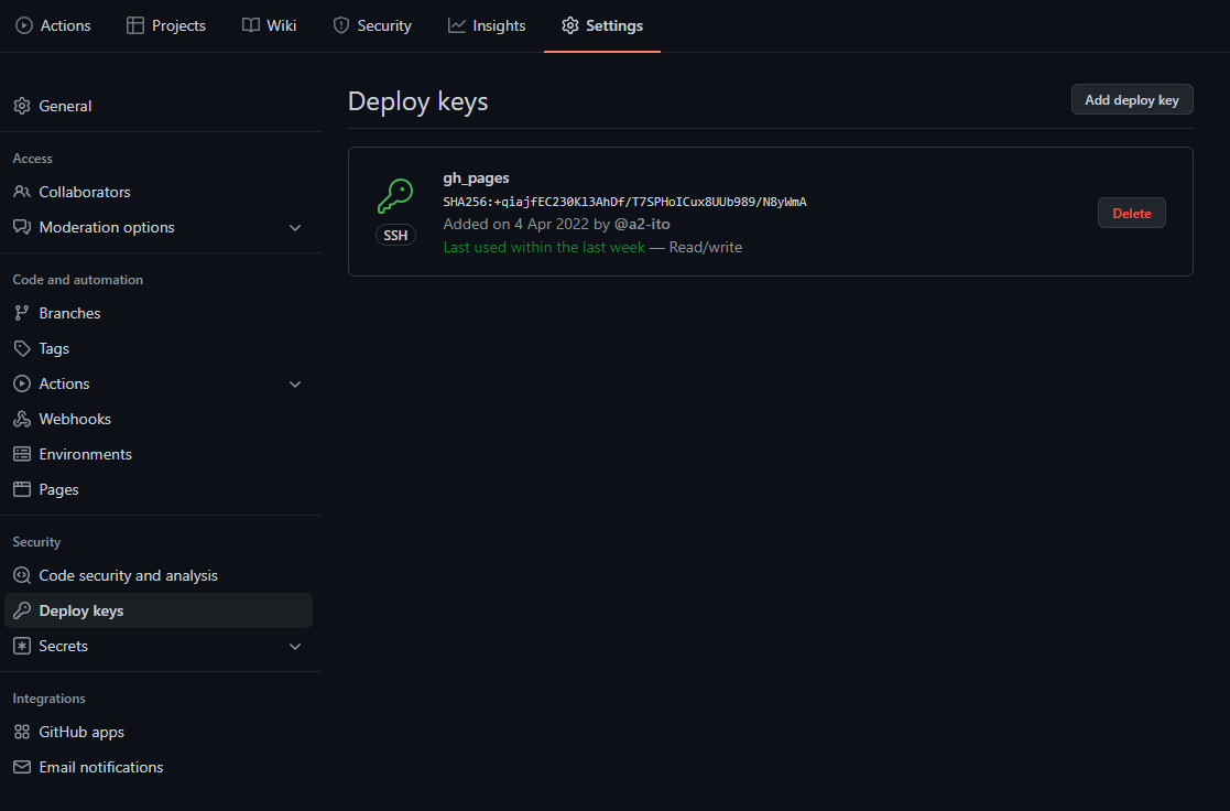 鍵の名前はなんでもいいですが、後述の Github Actions 上で指定する必要あるので、特に要件がなければACTIONS_DEPLOY_KEYでいいでしょう。