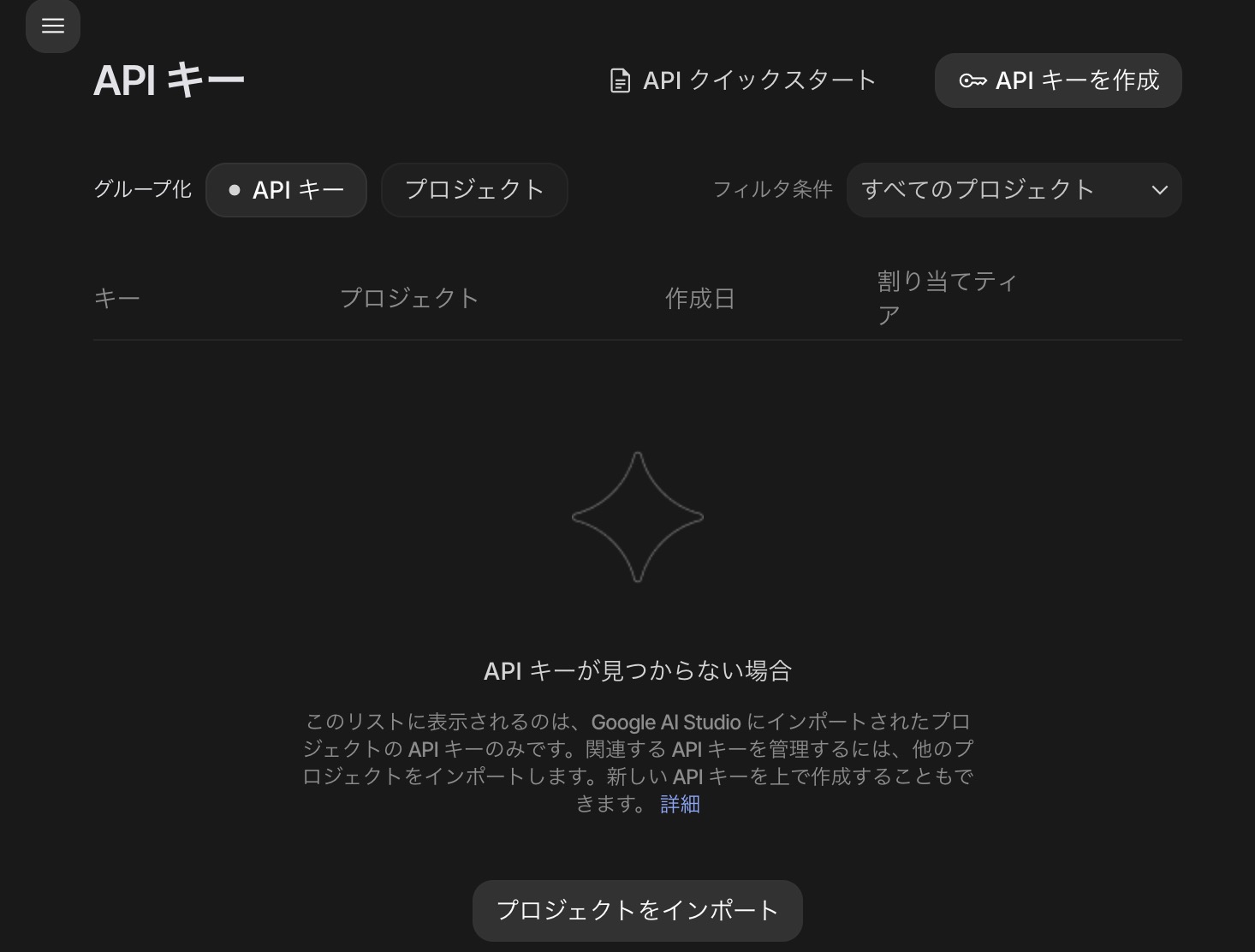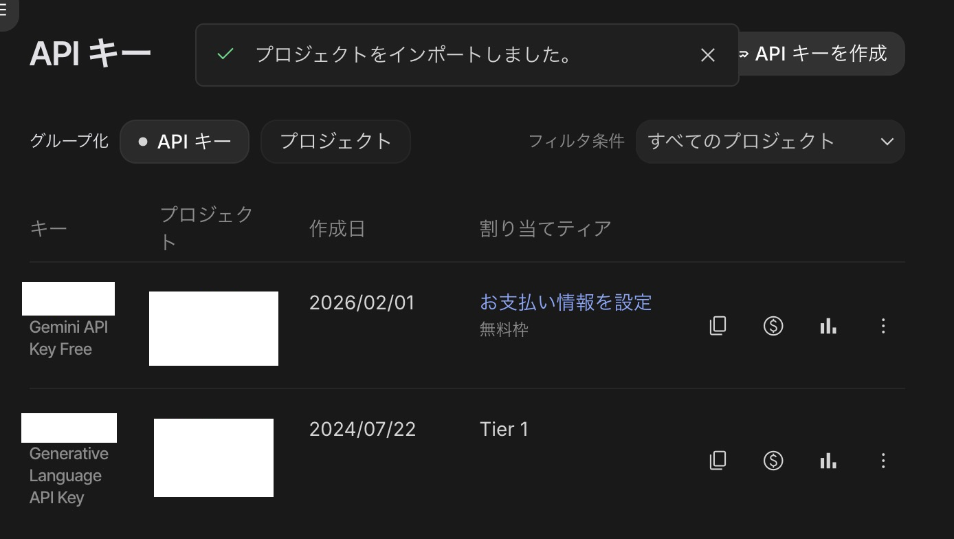 先述の通り、Google Cloud プロジェクトが必要であるため、あらかじめ作っておきましょう。プロジェクト作成後、APIキー発行画面でインポートを実行します。