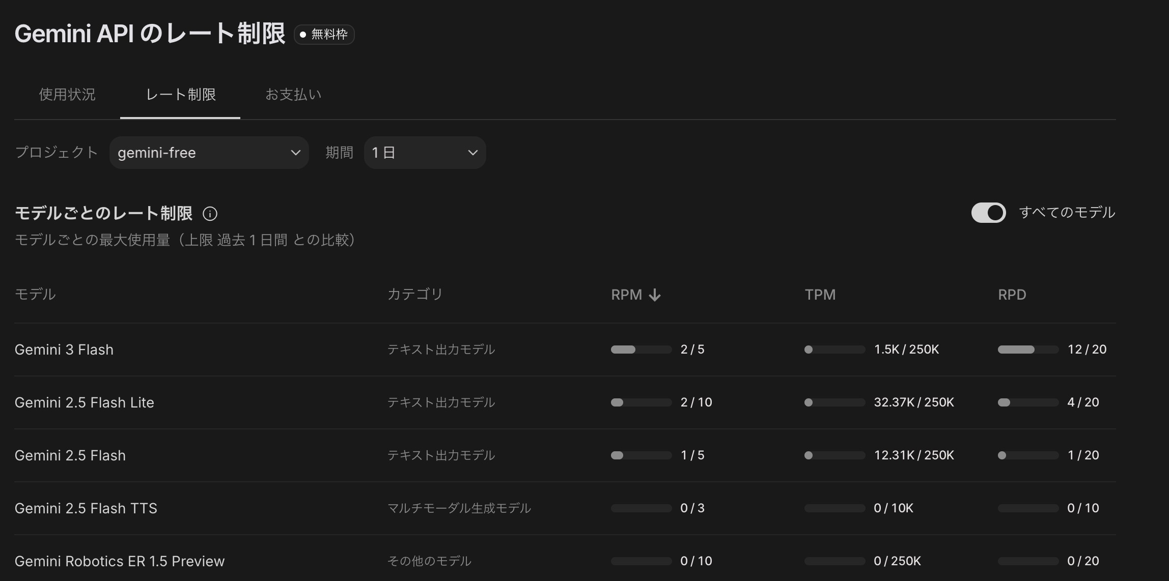 APIキーを作成すると以下のようにレート制限についてのページが参照できますので、そのページの情報が無料枠に関する最新情報と判断しています。